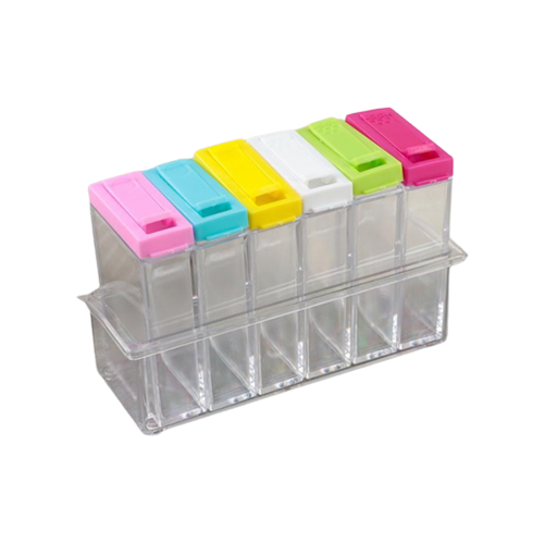 This is a set of kitchen accessories for compact storage of spices, herbs and condiments, allowing you to keep your work surfaces tidy. The set includes a stand that compactly holds 6 containers. Made of durable plastic with colorful lids. Easy to use containers can always be at hand, the set fits well in a drawer or on a shelf of the kitchen table. You do not need to unscrew the lid every time, you just open the valve. The interesting design and bright colors will not only fit into the decor of the modern kitchen, but also will give you a good mood in the morning.